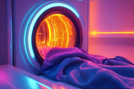 Inside view of a tumble dryer with freshly laundered clothes spinning drying and tumbling around, clothes care, modern, tumble, white, dryer, efficiency, convenience, cleanliness, clothes