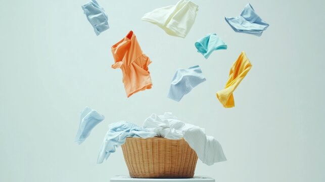 Colorful clothes tumbling into a laundry basket