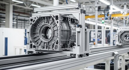 Intricate industrial machinery components are displayed on an assembly line, ready for manufacturing and production.