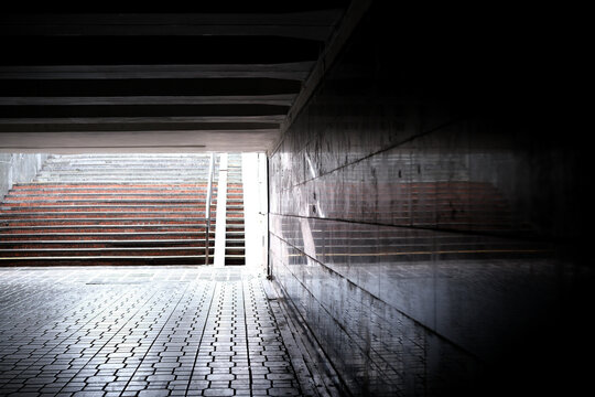 Light breaking through a tunnel leading to stairway steps
