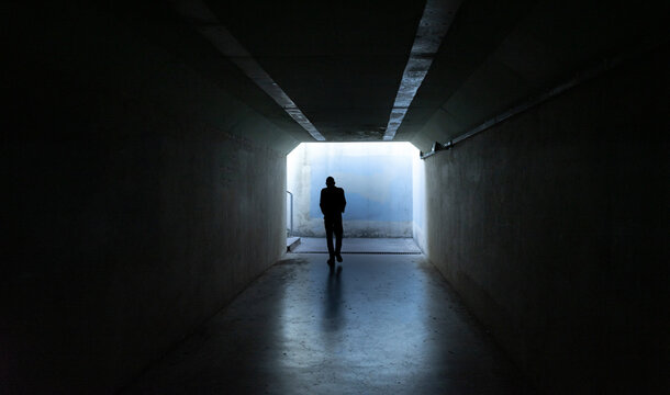Road tunnel in Alpine mountains, Switzerland. Inside the modern tunnel and view of entrance to next tunnel in summer.