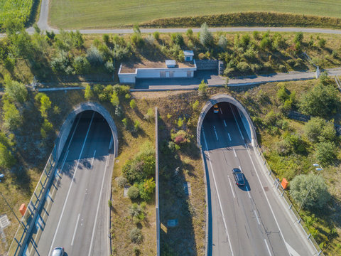 Aerial view of tunnel entrance of highway in Switzerland