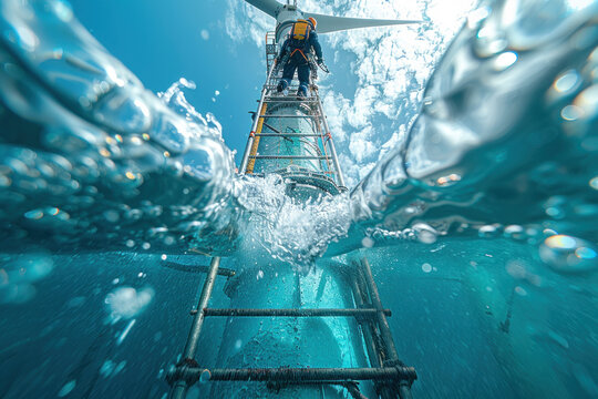 Offshore wind turbine base with ocean water at sunset creating renewable electricity. Clean energy and power generation for environment.