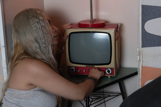 Platinum blonde girl, 25 to 30 years old, wearing a white tank top. Turning on an old television. Side view.. In a 70s style restaurant.