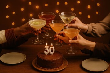 Friends celebrating 30th birthday home party with layer cake, gold 30 candles, balloons