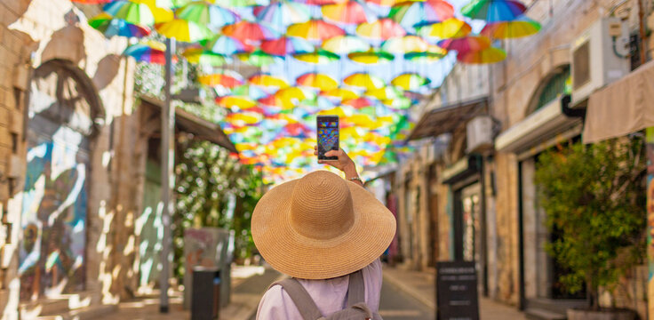 Back view of female traveler taking pictures of landmarks on her phone in the historic city of umbrella sky.