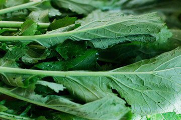 Close up photo of Fresh white turnip greens sitting on wooden table. Beautiful soft sunlight.