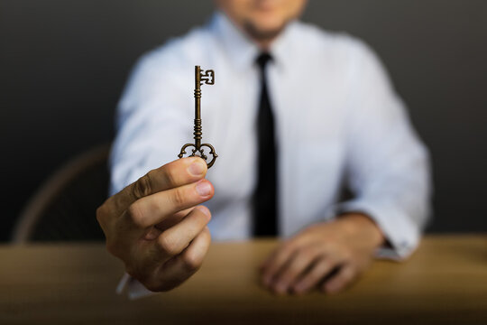 Man is holding a key with a glowing effect. Concept of unlocking something important or significant. The glowing effect adds a sense of mystery and intrigue to the image