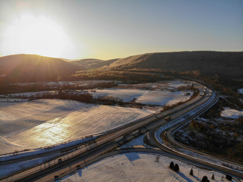 An aerial shot over a western Pennsylvania interstate in late Autumn.