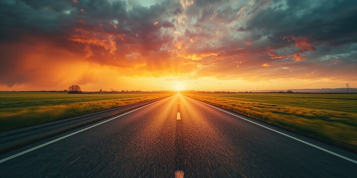 Colourful sunset at M1 motorway near Flitwick junction with blurry cars in United Kingdom