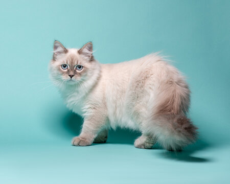 Fluffy grey cat with blue eyes in studio on turquoise background. Sitting Neva Masquerade kitten looking at camera on blue background. High quality horizontal photo of long-hair cat