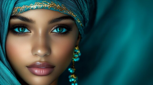 Close up portrait of beautiful young woman with blue eyes and turquoise scarf on blue background