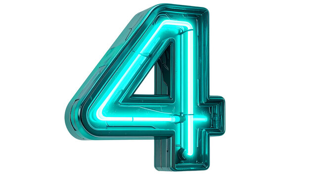 Illuminated, three-dimensional digit "4" glows with a striking turquoise neon light against a stark black background