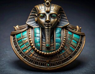 Round pendant featuring Tutankhamun’s funerary mask with gold finish turquoise and blue inlays and symbolic headdress for editorial ancient Egyptian culture jewelry design and historical artifact-them