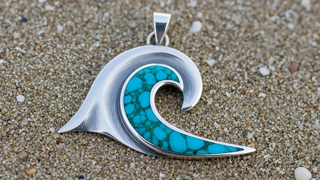 Silver Wave‑Shaped Pendant with Turquoise Inlay on Textured Beach Sand Background