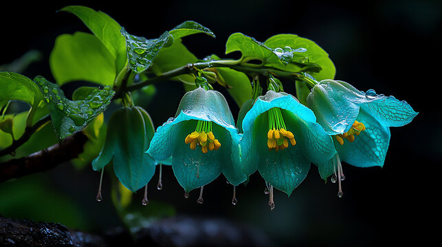 Jade Vine,rare flower,climbing plant,tropical vine.A Jade Vine blooming in a tropical rainforest, dramatic lighting highlighting the glowing turquoise petals