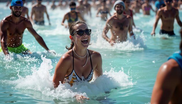 Balancing swimmer standing on starting block with pink glitter splash over turquoise pool