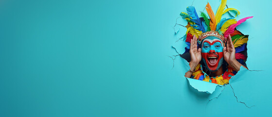 Close-up of a woman's blue eyes peeking through a turquoise torn paper, artistic portrait concept with captivating eye detail and vibrant background.