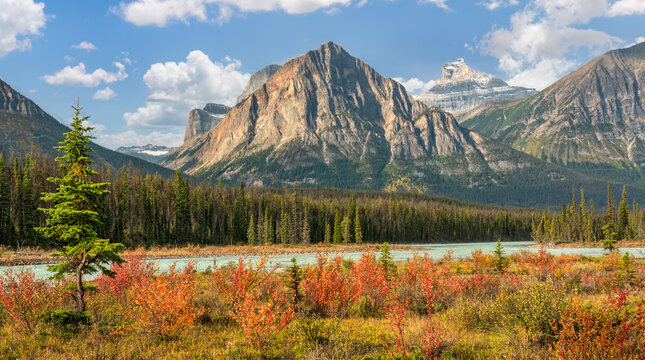 Autumn view from the Icefields Parkway across the turquoise waters of the Athabasca River - Banff National Park