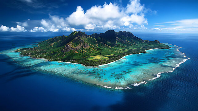 Breathtaking aerial view of a tropical island surrounded by crystal-clear turquoise waters and coral reefs