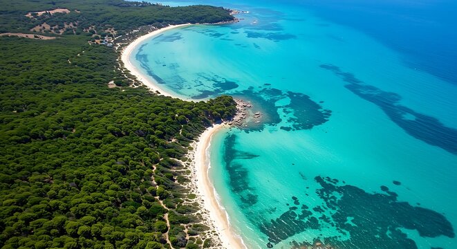 Aerial view of serene coastal landscape with sandy beaches and rocky outcrops