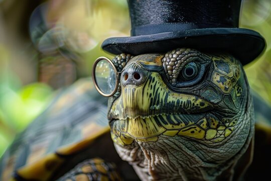 A close-up image of a turtle wearing a top hat and monocle, looking stylish and sophisticated, A turtle wearing a top hat and monocle, looking very dapper