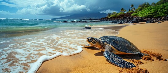 Green sea turtle on Hawaiian beach, Oahu.