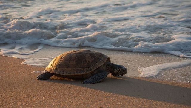 Green sea turtle crawling toward foamy surf on golden hour sandy beach