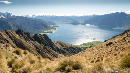Vast desert plain with tumbleweed and scattered grass tussocks under clear blue sky