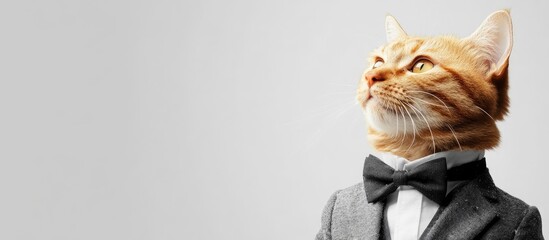 Ginger cat wearing a tuxedo and bow tie with neutral background and copy space for text