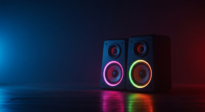 Electrifying pair of speakers glowing with radiant RGB lighting for immersive audio experience and
