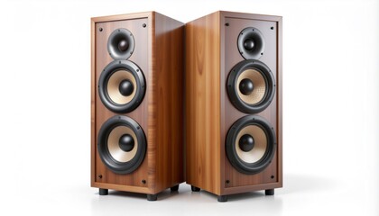Premium Teak Wood Tower Speakers with Black Vinyl Accents Isolated on Clean White Background