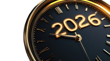 A close up of a golden clock face displaying the year twenty twenty six with a black background on transparent background
