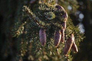 Pine cones growing on an evergreen or fir tree branch in a forest nursery. Close up shot, foggy autumn day, no people