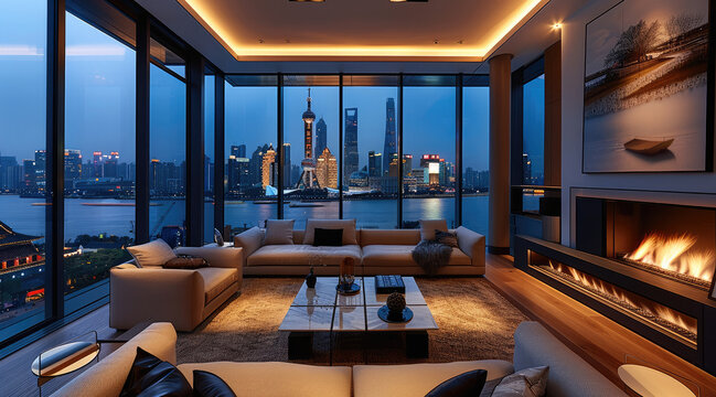 Modern penthouse living room with skyline view of Shanghai, nighttime, cozy sofa and armchairs around the fireplace, open kitchen in the corner with a large window overlooking the river.
