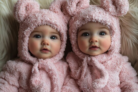 twin babies, dressed in matching pink bunny outfits, looking at the camera. They are surrounded by a soft, fluffy background.