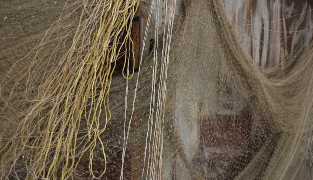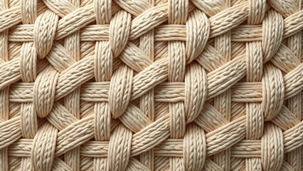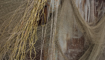 Close up of tangled rope net, with blurred aqua background. Texture of marine cord shows knots and mesh structure. Abstract sea life concept for fishing or safety.