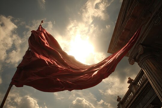 Minimalist architectural composition bold red wall gray column blue sky and orange shadow
