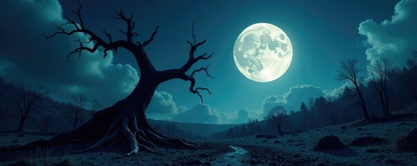 Bioluminescent forest glowing at night with tree roots casting blue light trails