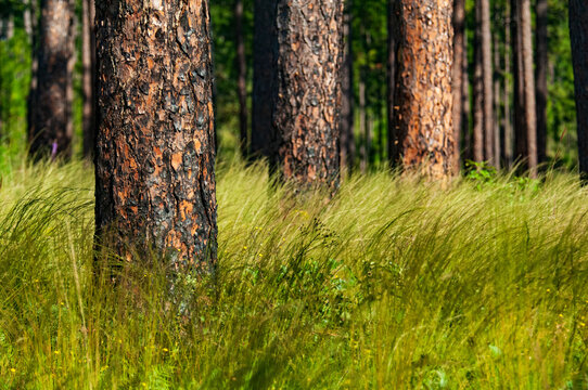 Bending and twisting trees at the Crooked Trees tourism site in a sunny summer rural landscape