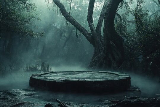 A podium surrounded by mist in a mysterious swamp, with dark, twisted trees in the background.
