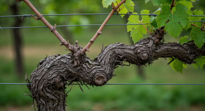 Old grapevine trunk with twisted bark and young green leaves on wire trellis. Vineyard cultivation for wine production and sustainable agriculture
