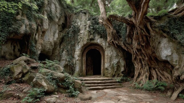 weathered stone cave entrance surrounded by twisted tree trunks and vines