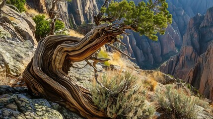 Pine tree with unique twisted trunk and gnarled branches in a scenic mountainous area, wilderness, pine, trunk, nature, branches