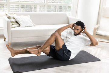 Focused young African athlete guy twisting body in boat pose during morning routine fitness activity, doing abs workout, training core muscles at home, exercising on mat
