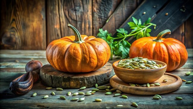 Two pumpkins and a bowl of seeds on a rustic wooden surface