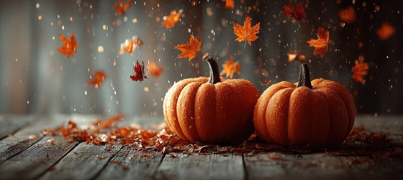 Autumn pumpkin on rustic wooden surface with falling leaves