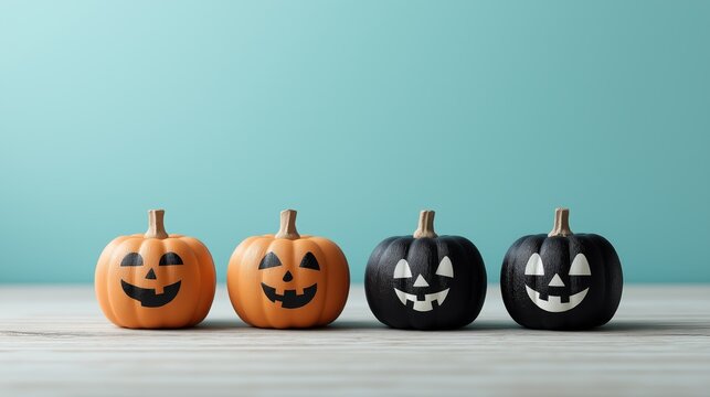 Four decorative pumpkins, two orange and two black, with carved smiling faces, arranged on a wooden surface against a light blue background.