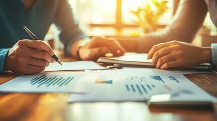 Close-up of two people analyzing financial documents and bar charts on a wooden desk in warm light. Teamwork, business strategy, and data analysis concept.