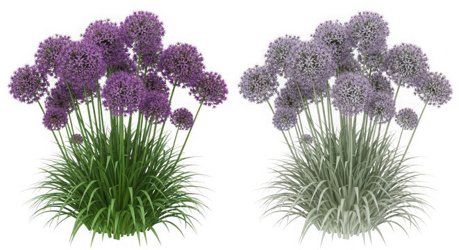 Two clusters of purple allium flowers with tall green stems and grassy foliage, isolated on transparent background